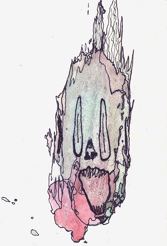The creation of this one followed an unusual pattern- the color came first and the details after. I was fooling around with watercolors and got this odd looking splatter which, to me anyway, strongly suggested the face I drew in once the paper had dried.