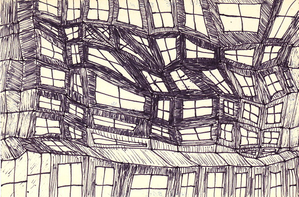 The title comes from the fact that, as with "This Side Up" every angle is basically correct for the picture because of warped perspective. This picture probably came before "This Side Up", actually, but in keeping with my sense of humor it got its current name. Many of these pieces were named arbitrarily many years after they were drawn, and if the titles played off each other, it had to do with the order they were drawn out of the box- which was not necessarily the order in which they were created. The writing you see bleeding through some of the windows is actually "This Side Down" written all over the back. Shouldn't have done it but as always hindsight is 20/20.